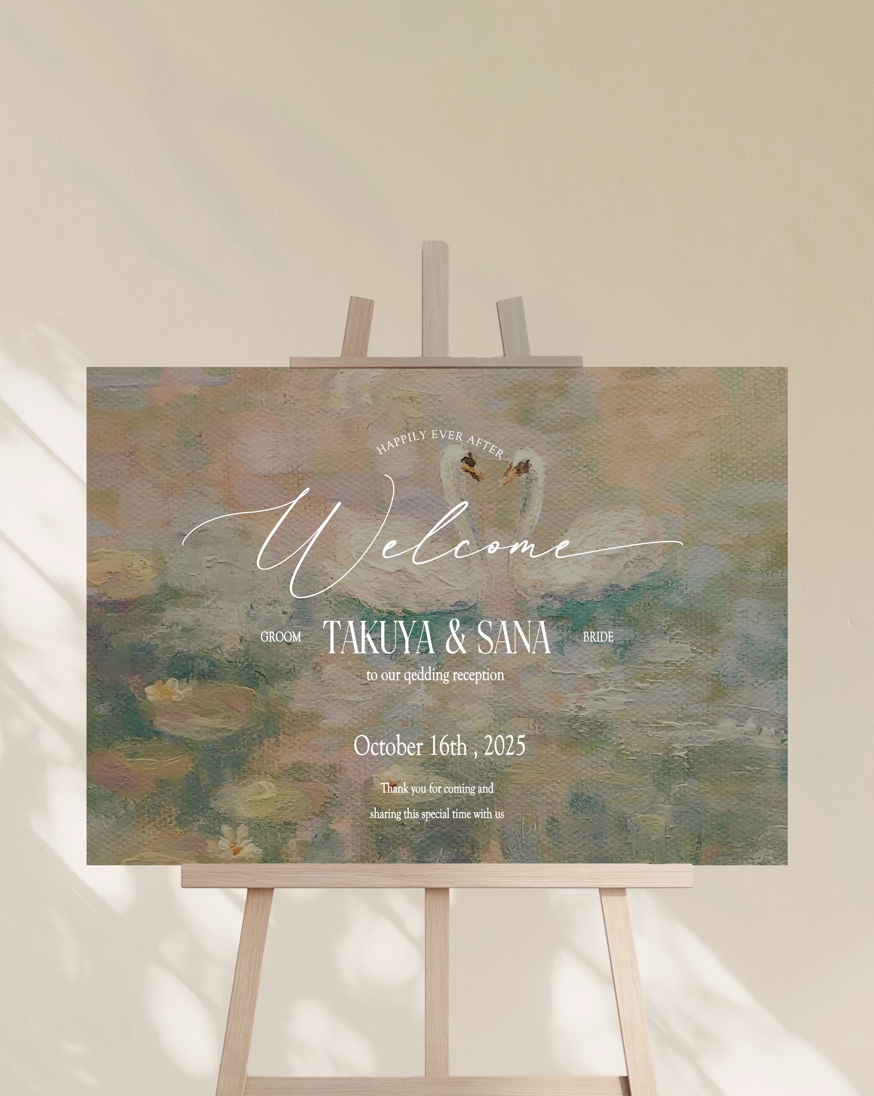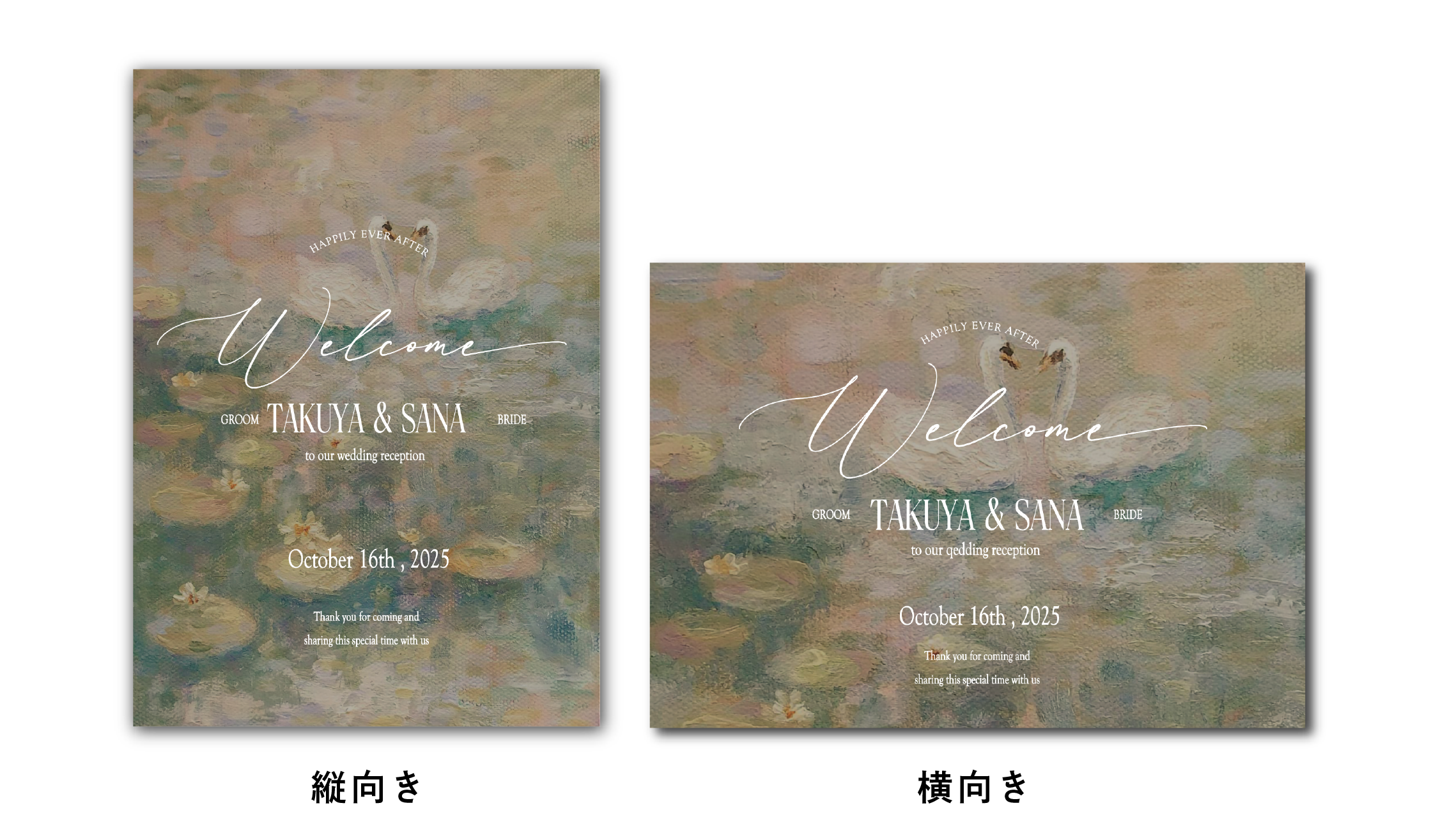 淡いトーンに白鳥を描いた背景。優しい色合いで柔らかい雰囲気を演出し、ロマンチックな式や落ち着いた空間に合います。派手すぎず、上品に飾りたい方におすすめです。