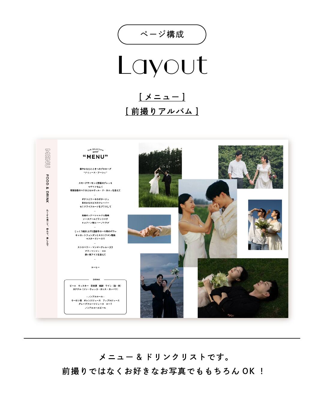 メニュー&ドリンクリストです。前撮りではなくお好きなお写真でももちろんOK!