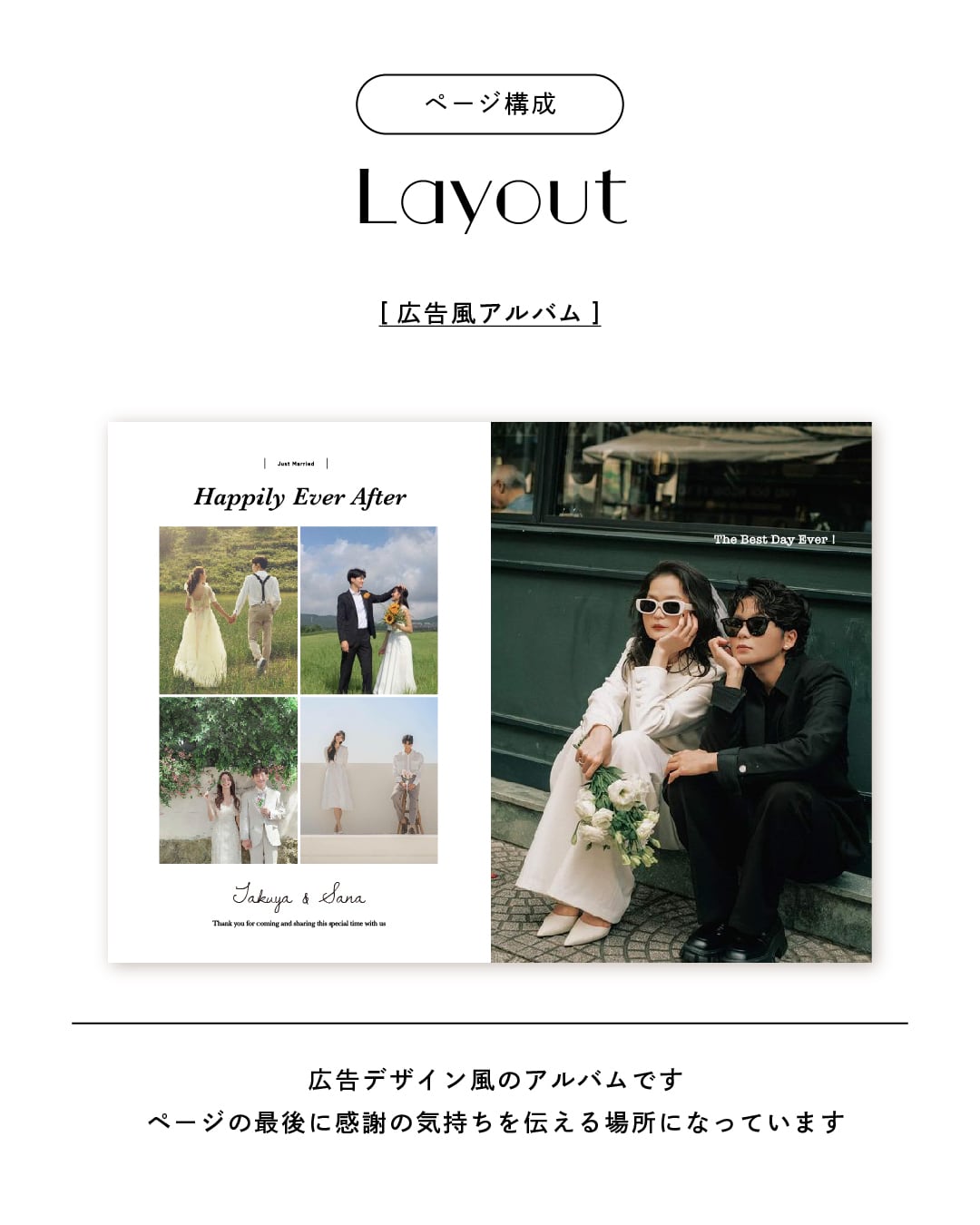 広告デザイン風のアルバムです。ページの最後に感謝の気持ちを伝える場所になっています。