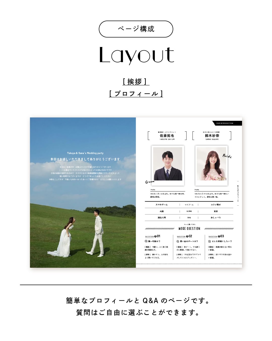 生年月日や出身地などの基本情報だけでなく、出会いや馴れ初め、思い出の写真や前撮り写真などを盛り込めば、ゲストさまにおふたりについて知ってもらうとてもよい機会になります。