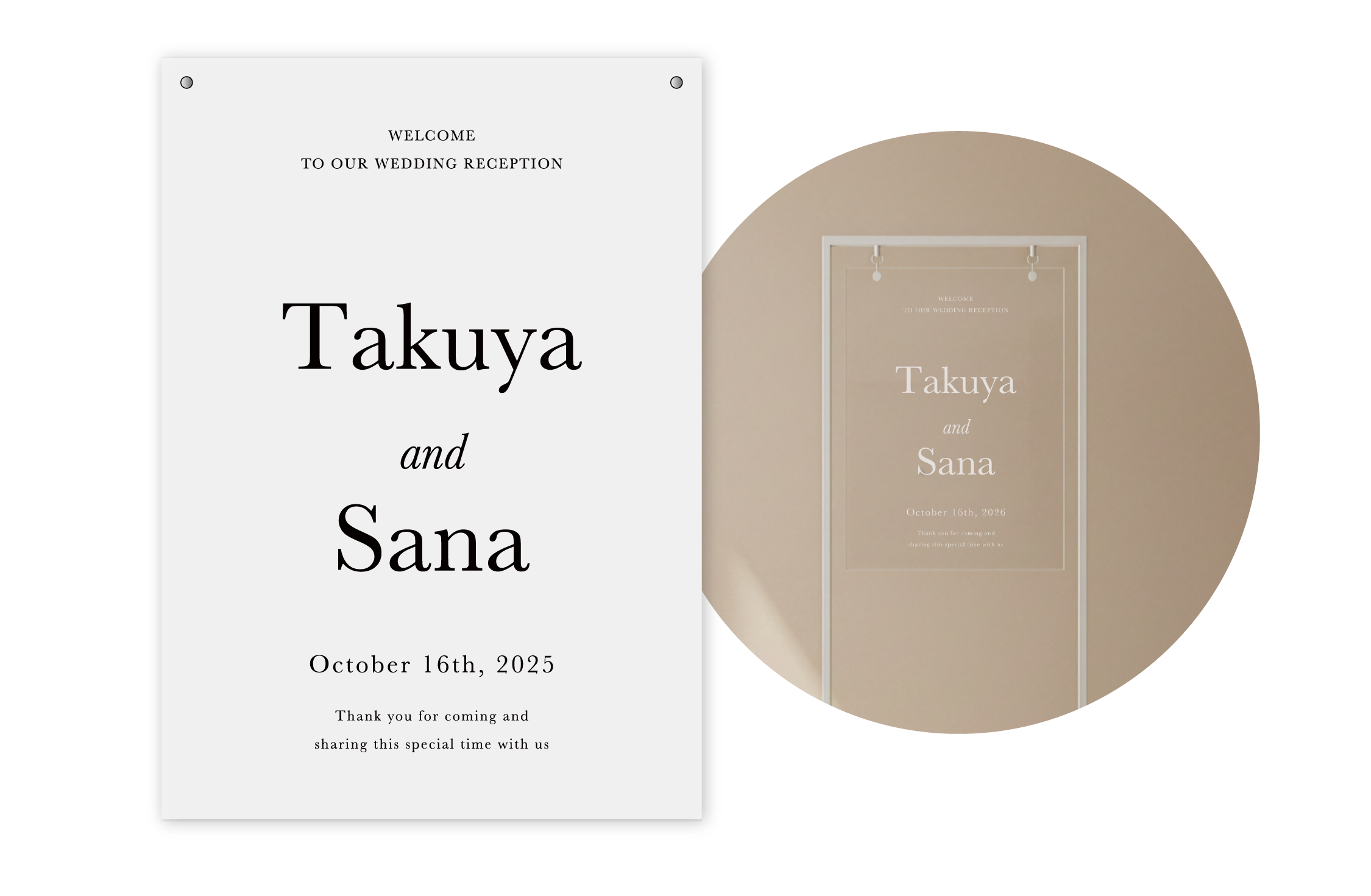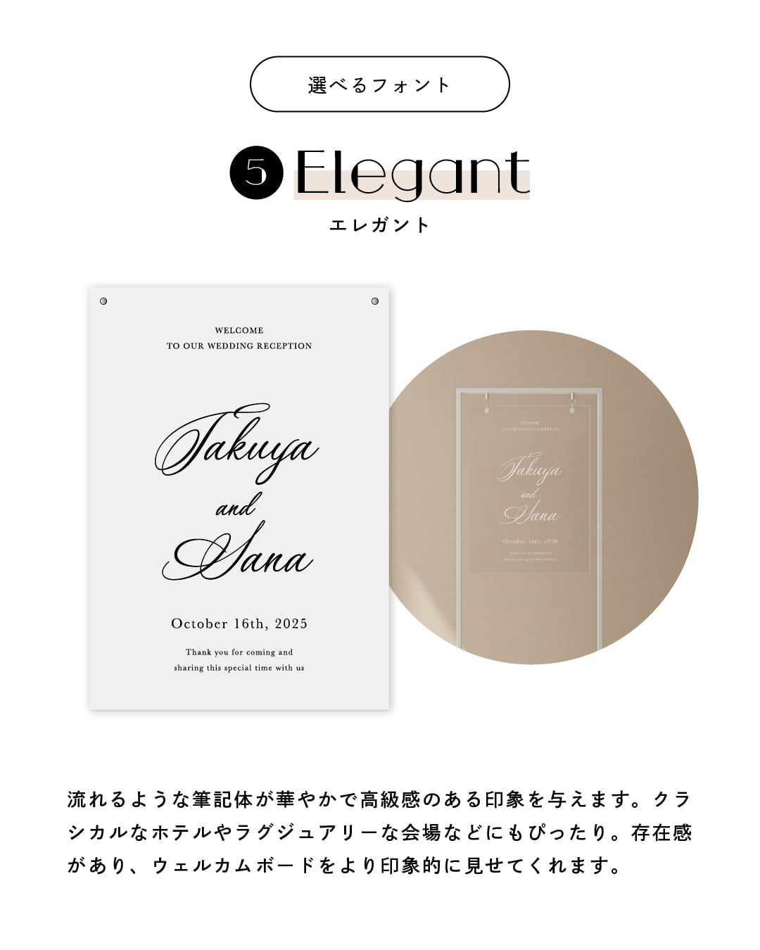 流れるような筆記体が華やかで高級感のある印象を与えます。クラシカルなホテルやラグジュアリーな会場などにもぴったり。存在感があり、ウェルカムボードをより印象的に見せてくれます。