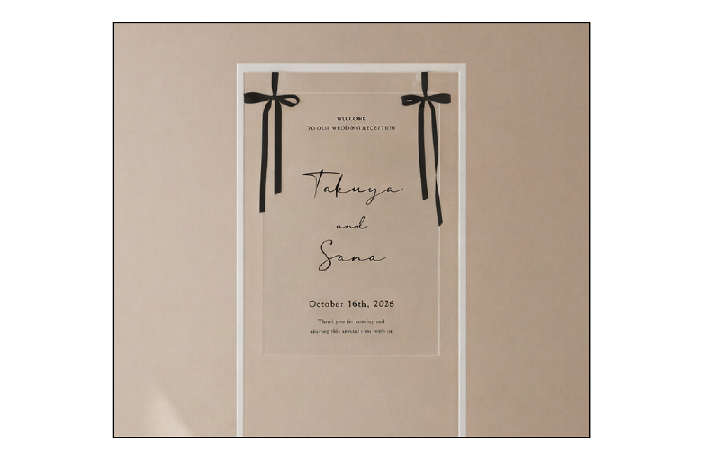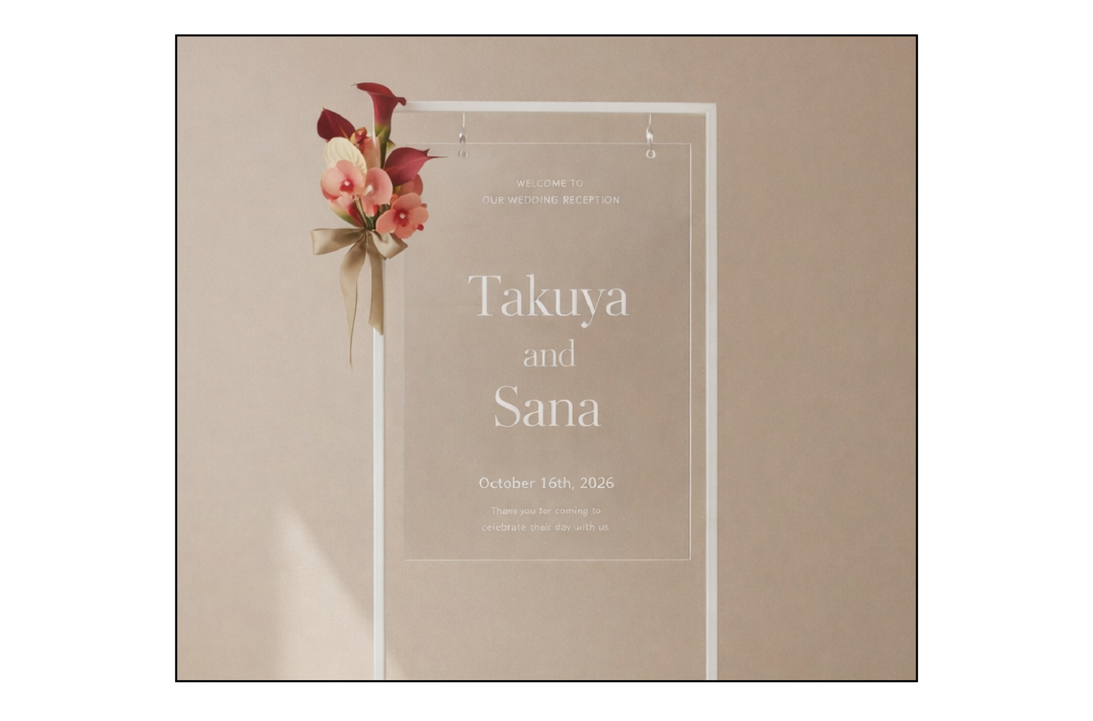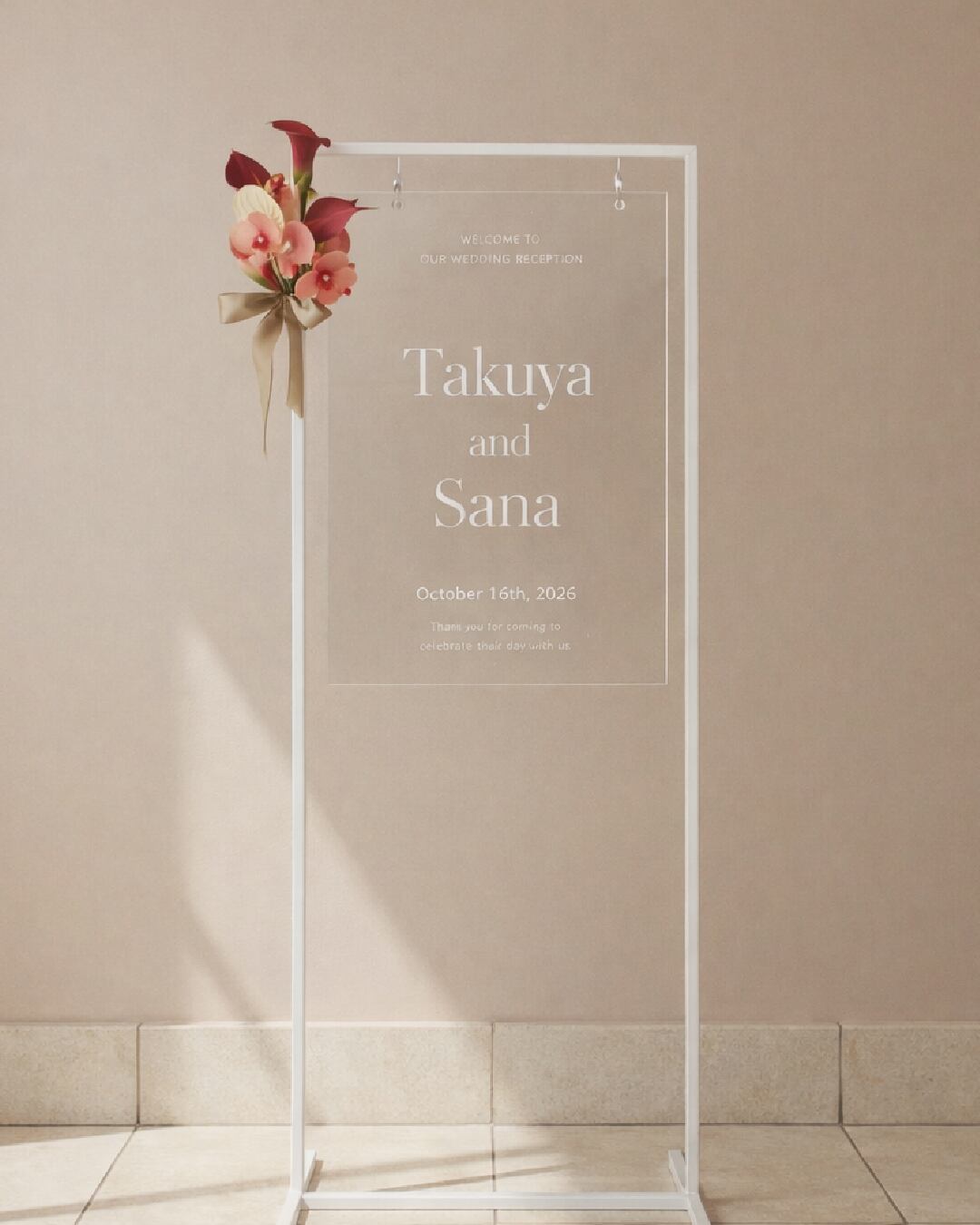 厚さ5mmの透明なアクリル素材を使用した透明のウェルカムボードです。
