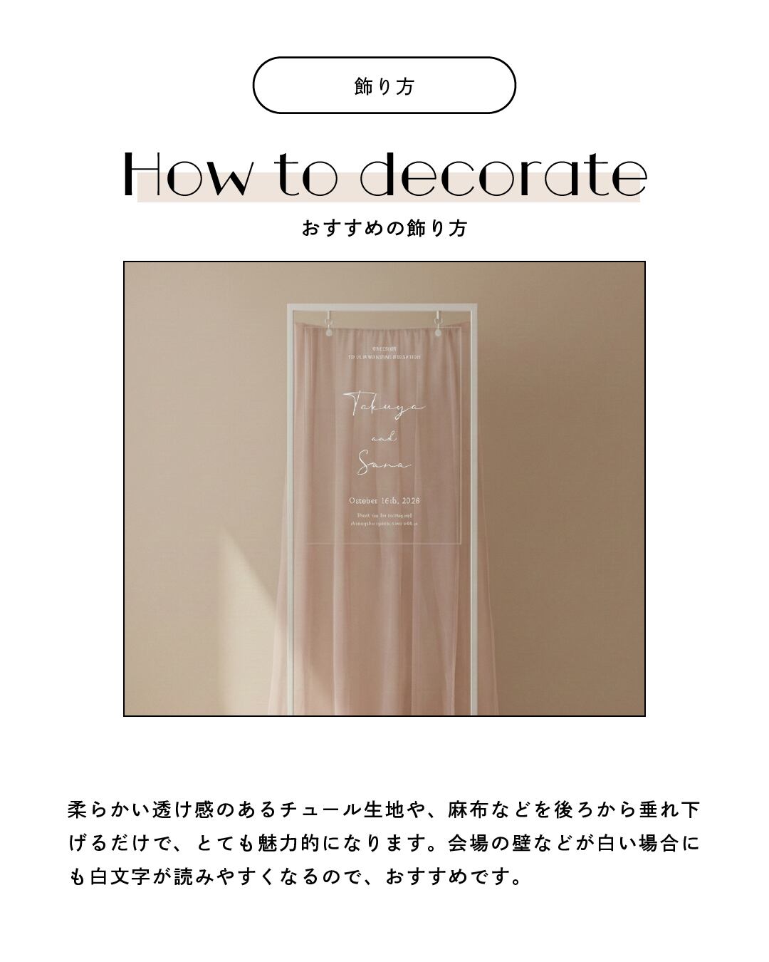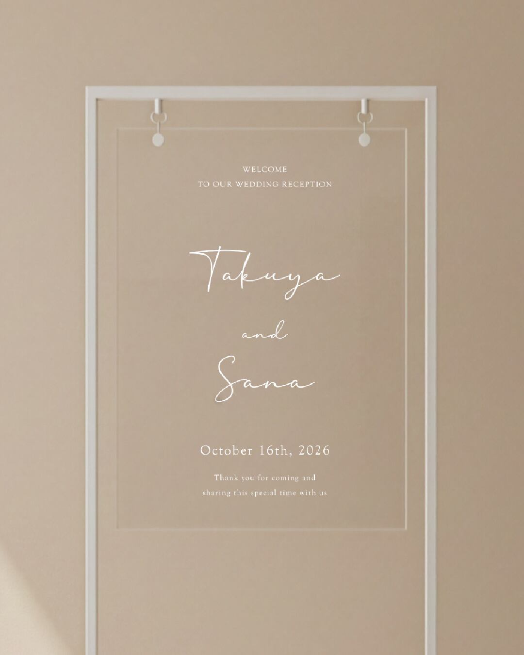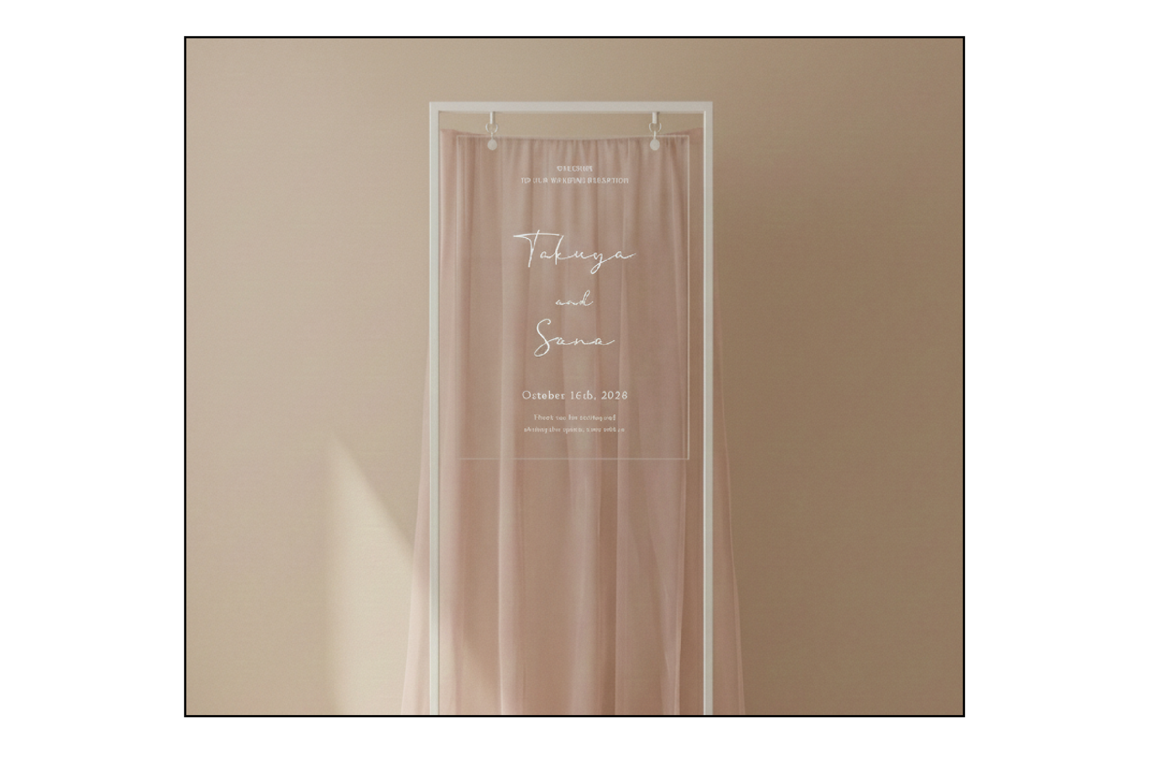 厚さ5mmの透明なアクリル素材を使用した透明のウェルカムボードです。