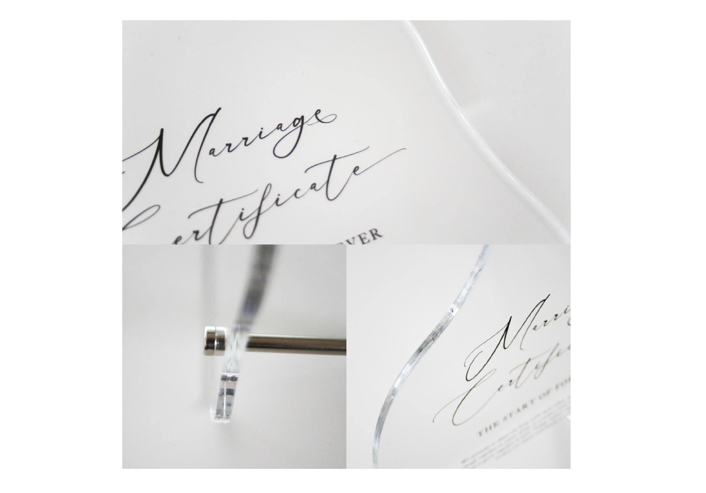 アクリル結婚証明書(280×205mm およそA4サイズ)、スタンド脚60mm(2本)