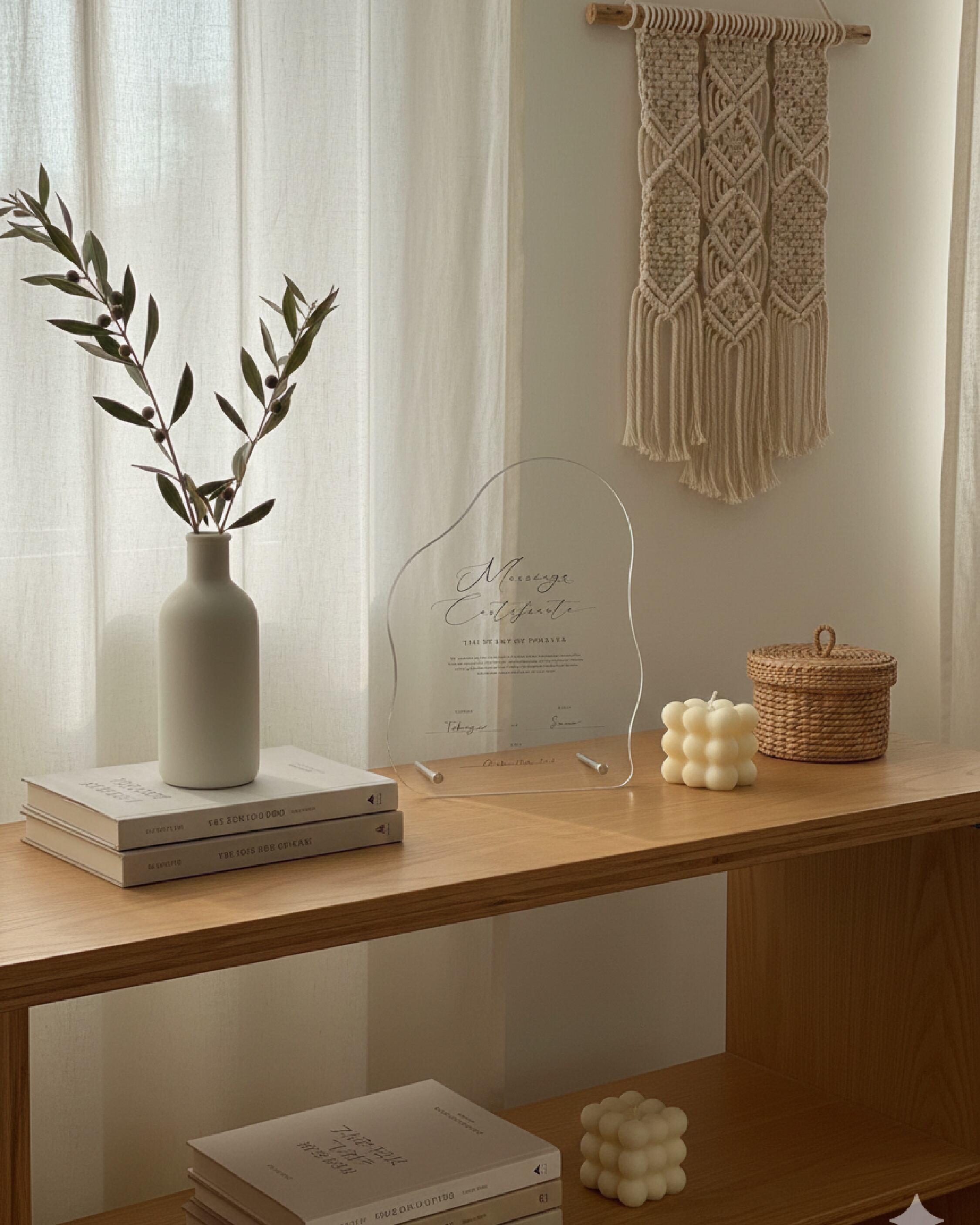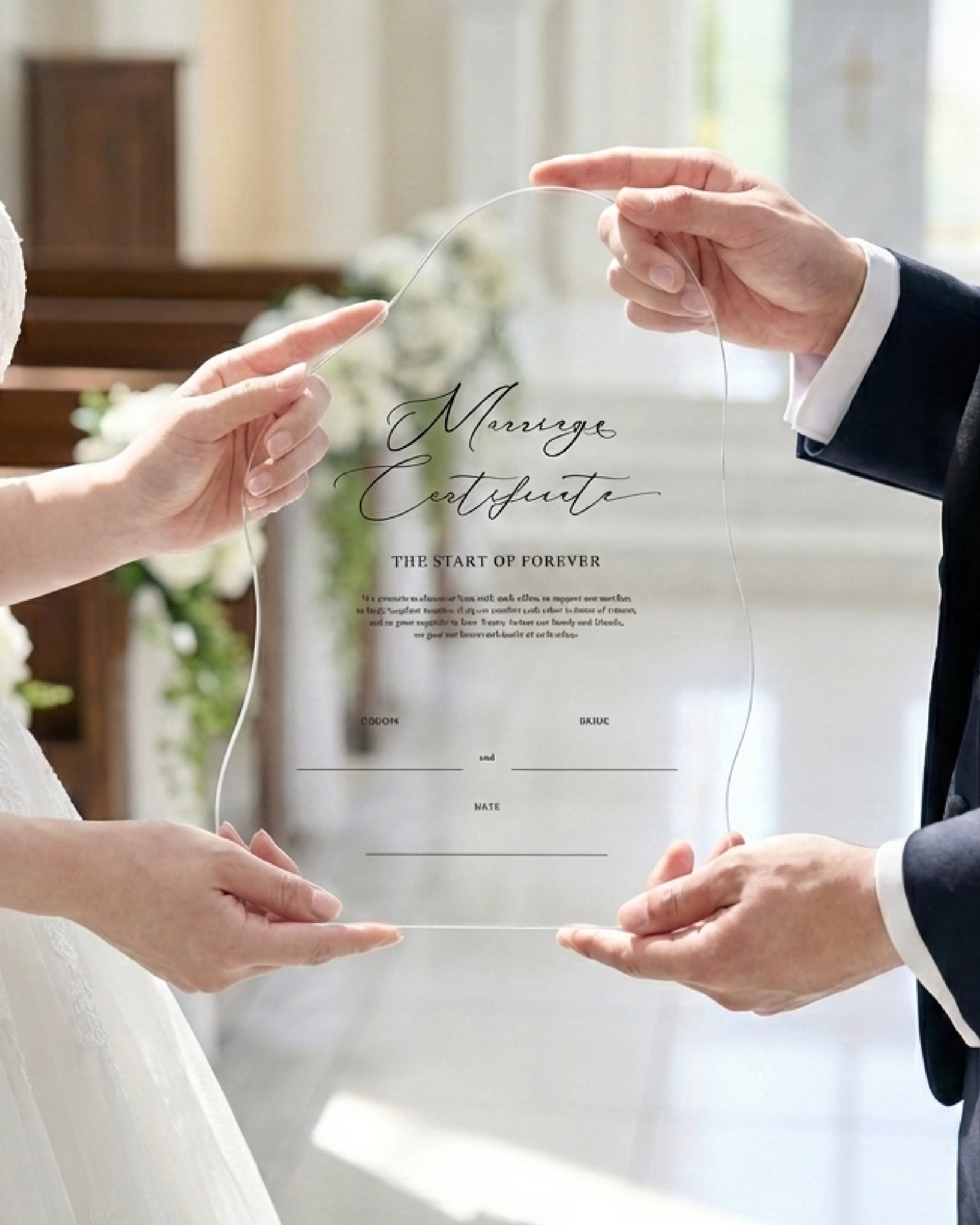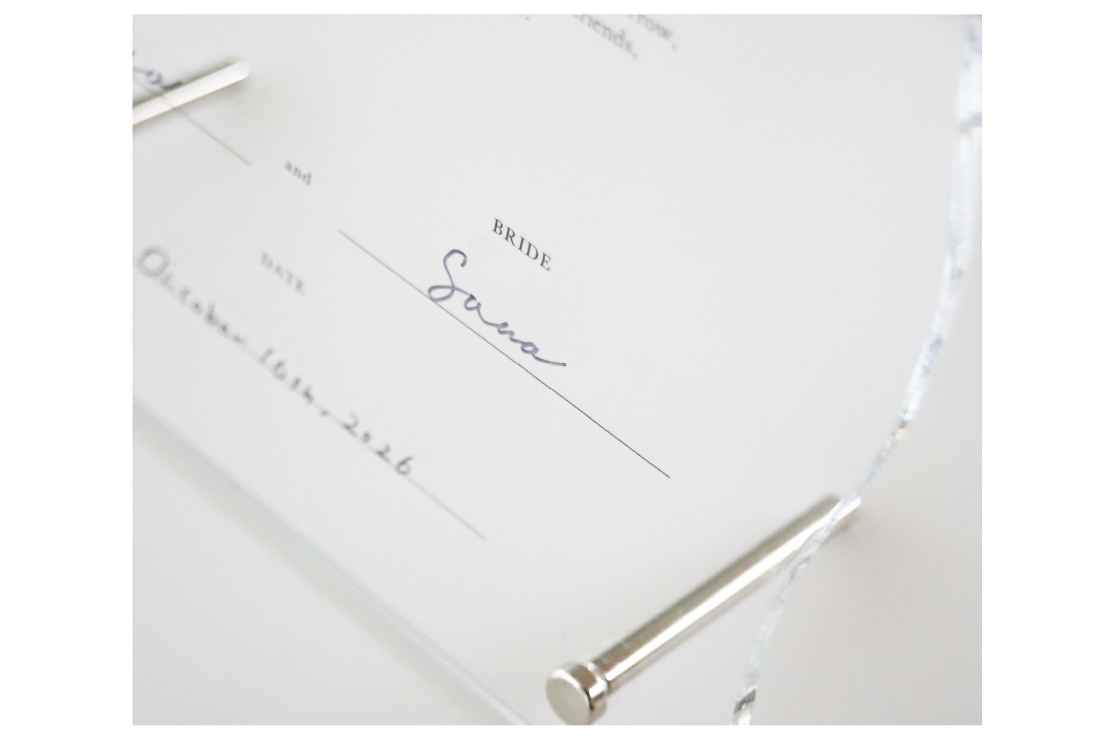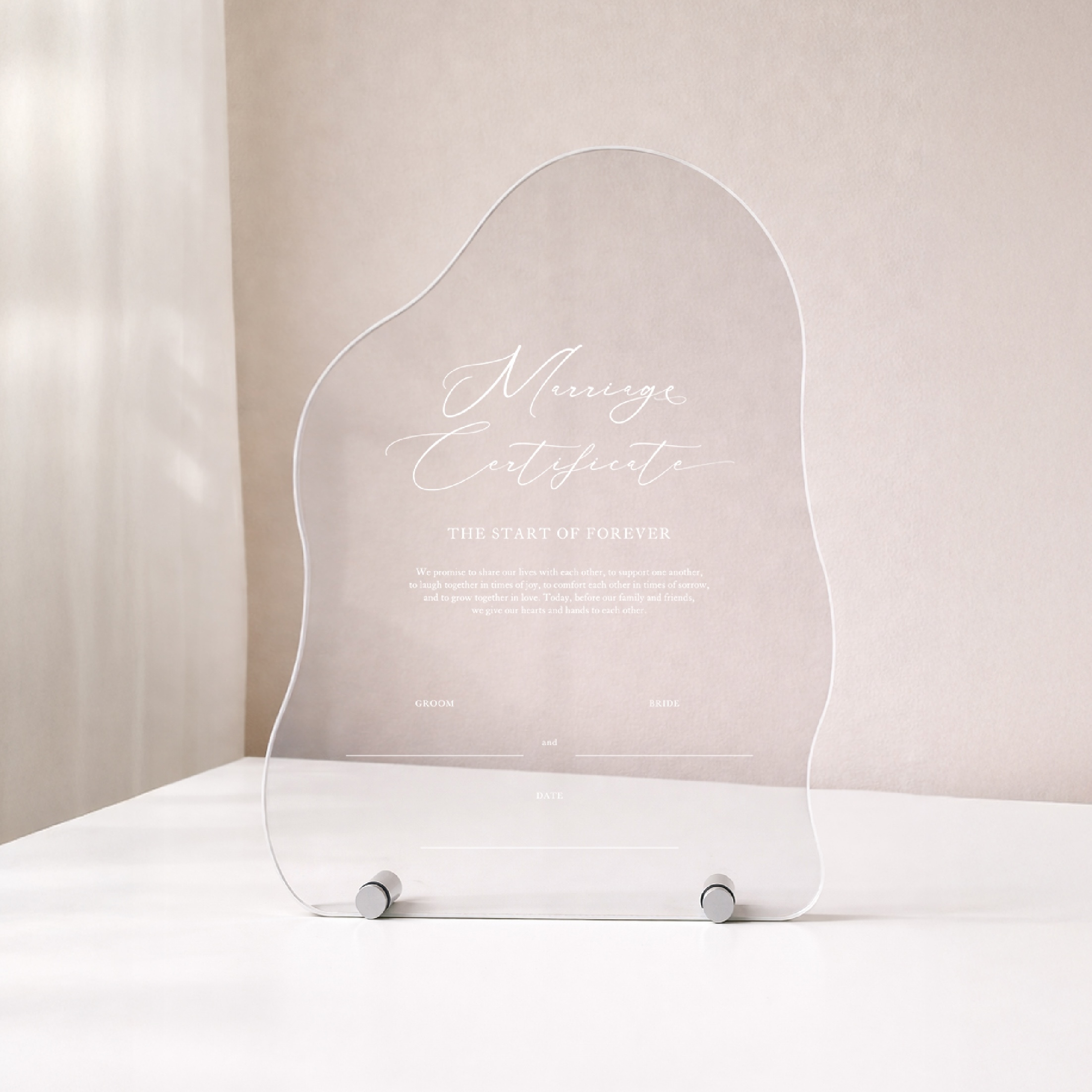 透明感のある素材を生かした、水のような柔らかいゆらめきを表現したデザインのアクリル結婚証明書です。光や背景を取り込みながら、空間に静かな存在感を与えてくれます。
