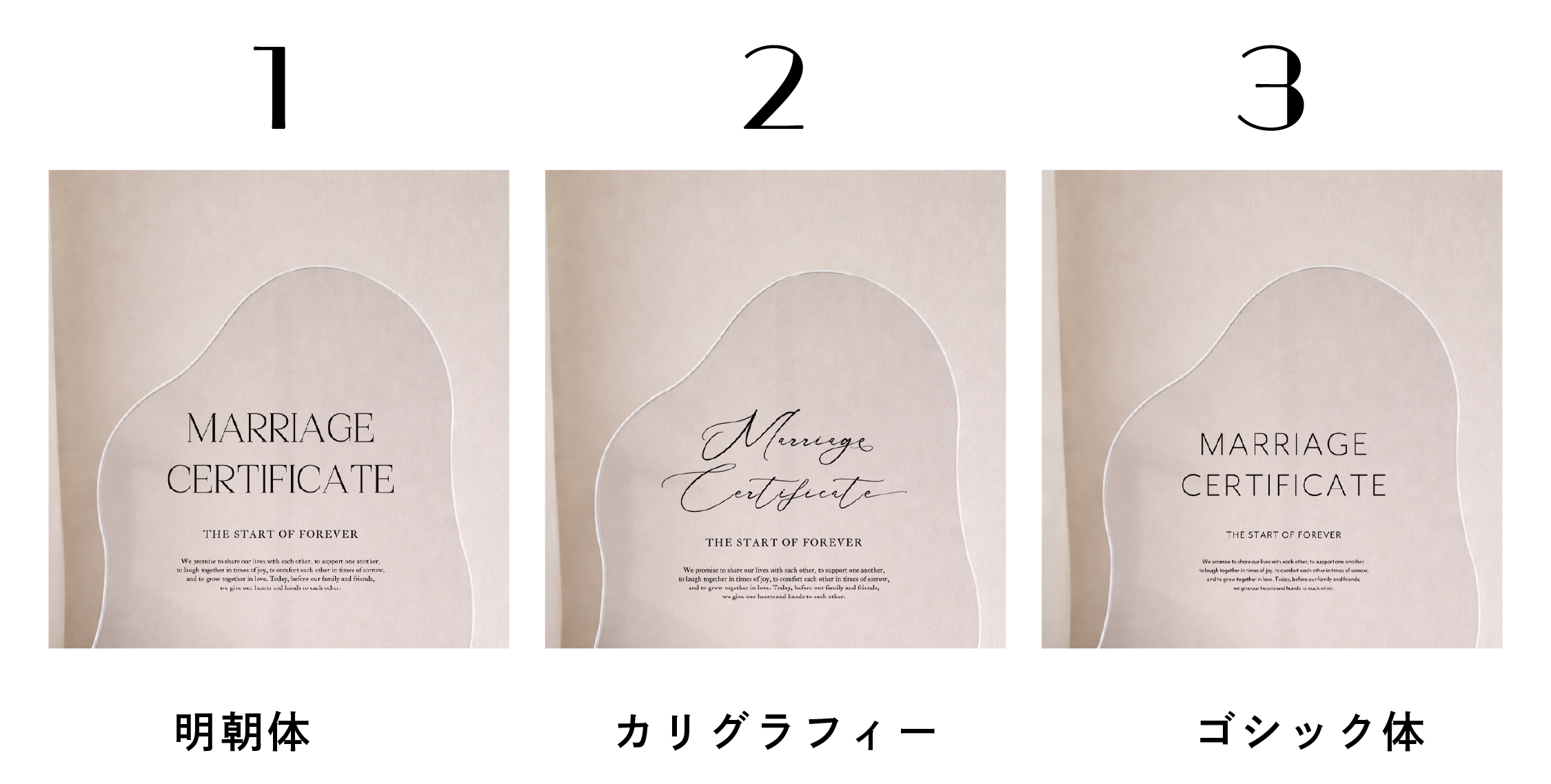 繊細な線の強弱があり、上品で落ち着いた印象のフォントです。格式や特別感を大切にしたい方に向いており、透明アクリルの静かな佇まいとも美しく調和します。