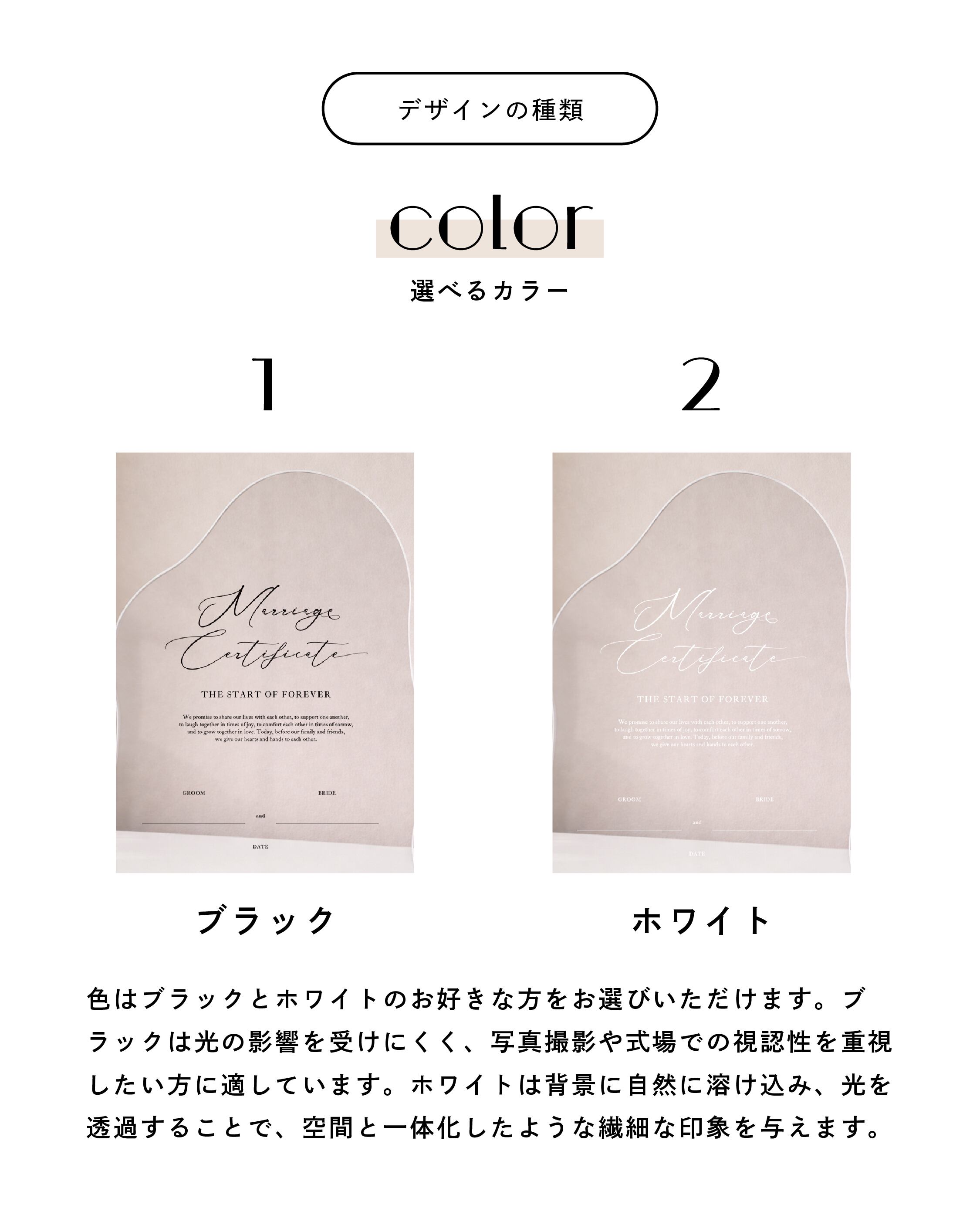 色はブラックとホワイトのお好きな方をお選びいただけます。ブラックは光の影響を受けにくく、写真撮影や式場での視認性を重視したい方に適しています。ホワイトは背景に自然に溶け込み、光を透過することで、空間と一体化したような繊細な印象を与えます。