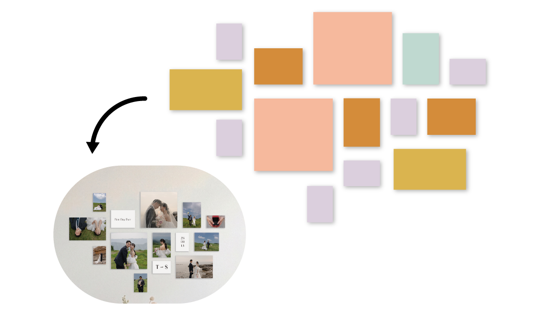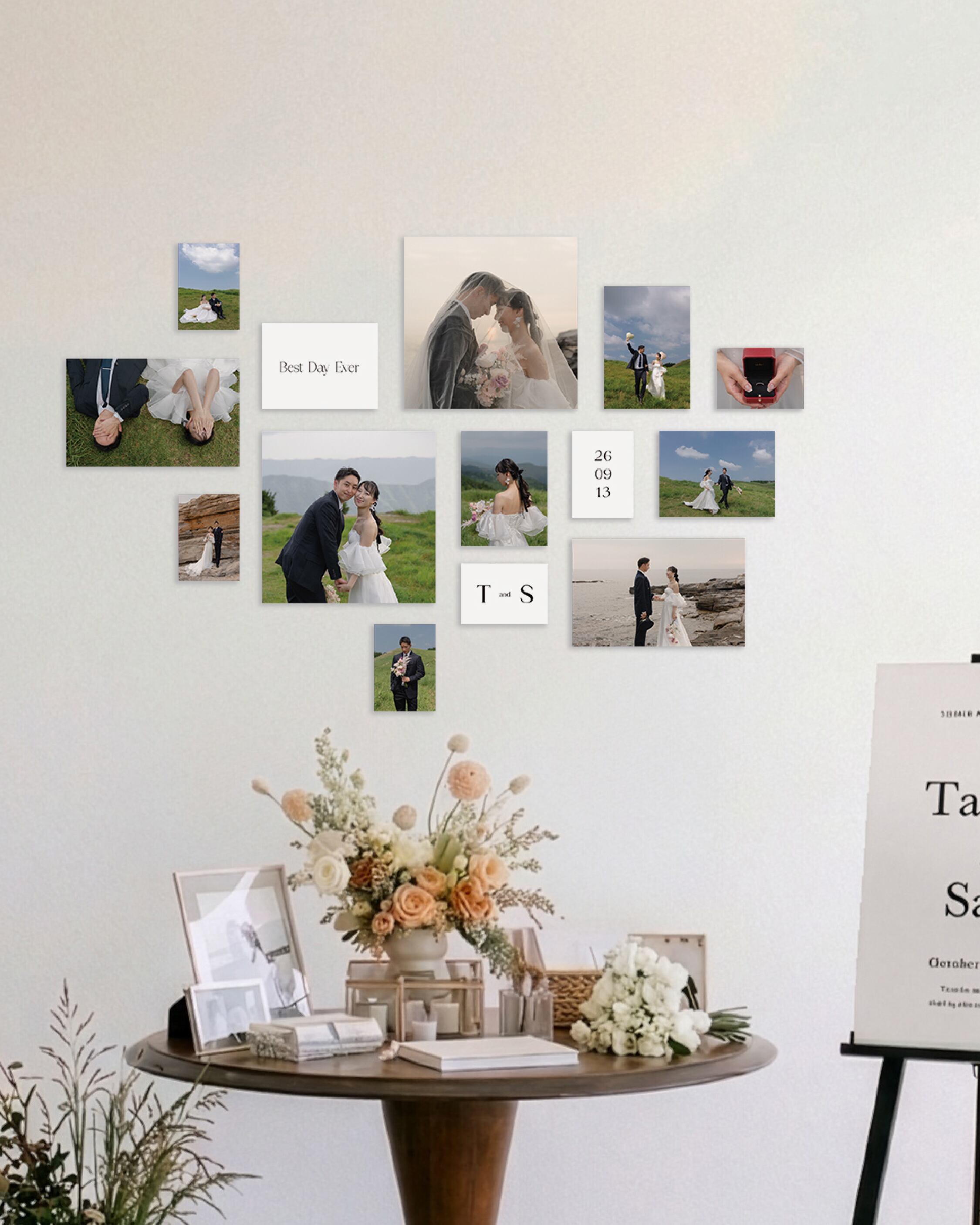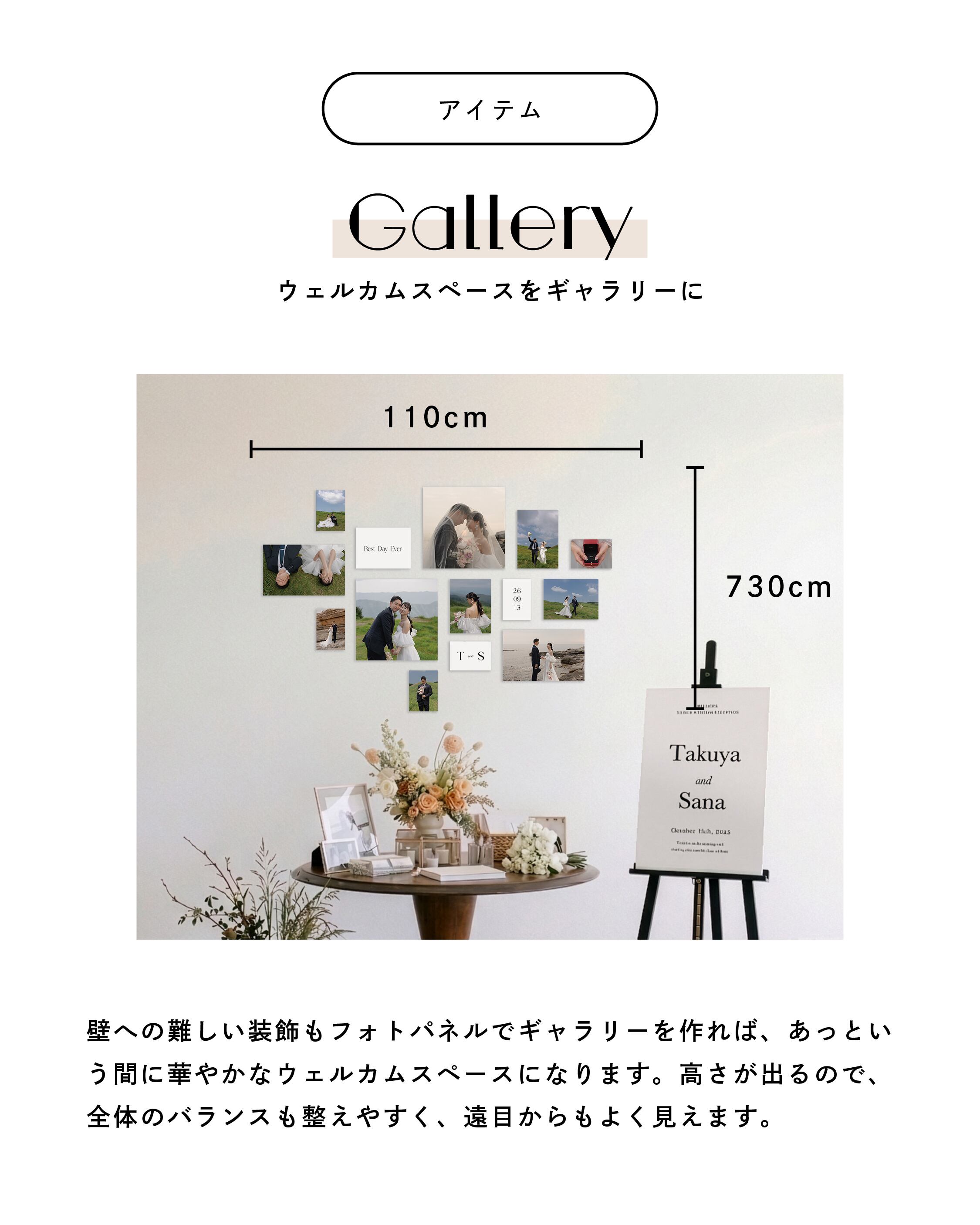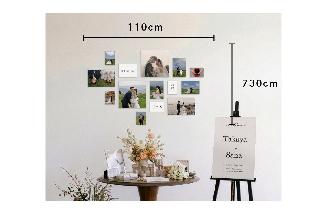 壁への難しい装飾もフォトパネルでギャラリーを作れば、あっという間に華やかなウェルカムスペースになります。高さが出るので、全体のバランスも整えやすく、遠目からもよく見えます。