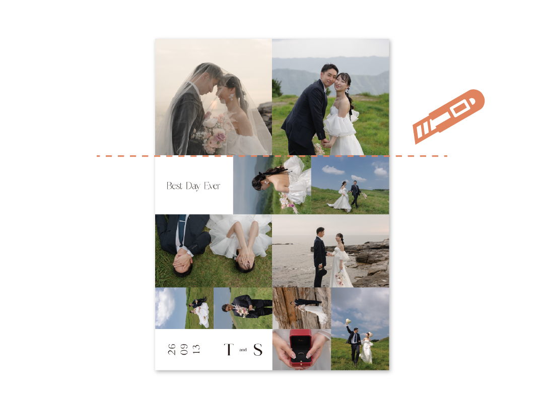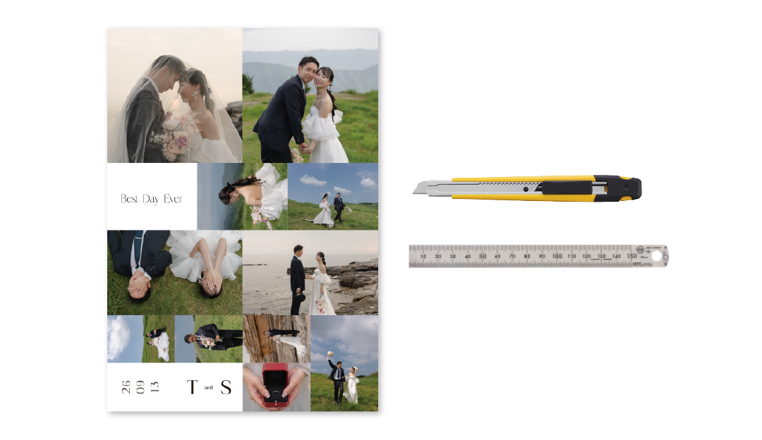 1枚の大きなパネルで届くので、カッターと定規で切り離してお使いいただけます。ご自身でカットして仕上げる仕様のため、価格を抑えることができたフォトパネルセットです。