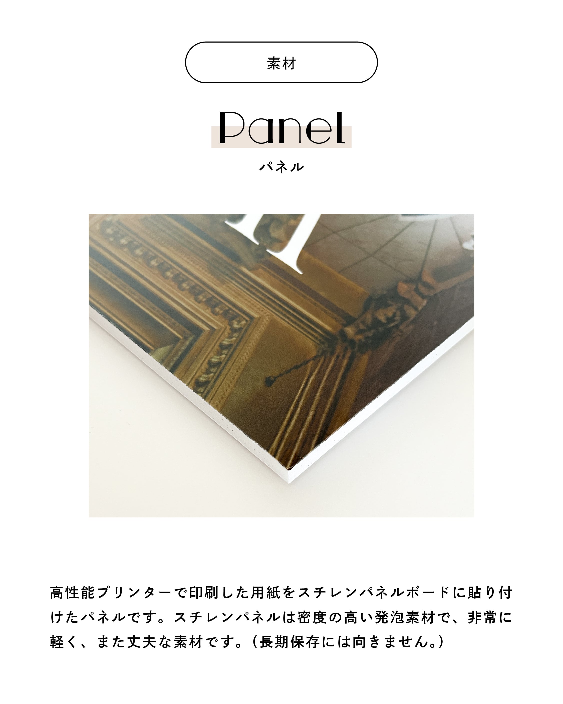 高性能プリンターで印刷した用紙をスチレンパネルボードに貼り付けたパネルです。スチレンパネルは密度の高いポリスチレンを主原料とした発泡板で、非常に軽く、また丈夫な素材です。(結婚式後の保存には向いておりません。)